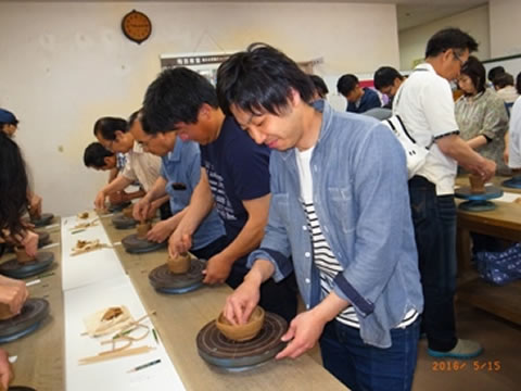 陶芸体験では各々、「ろくろ」を使い自分用の飯碗や湯呑を作りました。